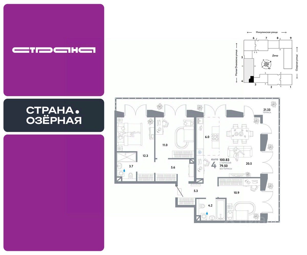 4комнатная квартира площадью 100,83кв. м. на 19этаже в доме "Байкал" жилого комплекса "Страна.Озёрная" . Срок сдачи дома - 2 квартал 2026 года.