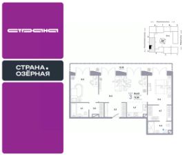 3комнатная квартира площадью 84,63кв. м. на 19этаже в доме "Байкал" жилого комплекса "Страна.Озёрная" . Срок сдачи дома - 2 квартал 2026 года.