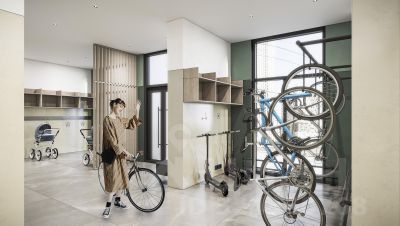 Паркинг с въездом по считыванию номеров, системой контроля выбросов CO2, тележками для покупок и велопарковкой торговая галерея на первом этаже дома.