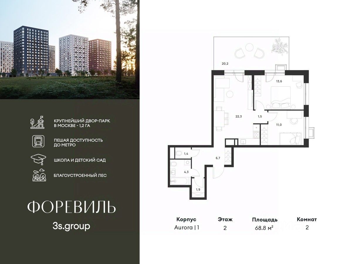 Продается уютная 2-комн. квартира площадью 68,8 кв.м на 2 этаже 17 этажного жилого комплекса бизнес-класса Foreville от 3S Group.
