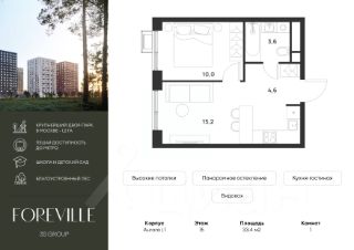 Продается уютная 1-комн. квартира площадью 33,4 кв.м на 15 этаже 17 этажного жилого комплекса бизнес-класса Foreville от 3S Group.