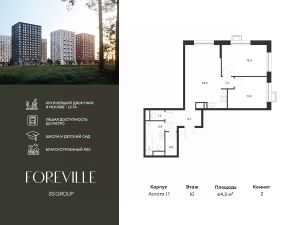 Продается уютная 2-комн. квартира площадью 64,3 кв.м на 10 этаже 17 этажного жилого комплекса бизнес-класса Foreville от 3S Group.