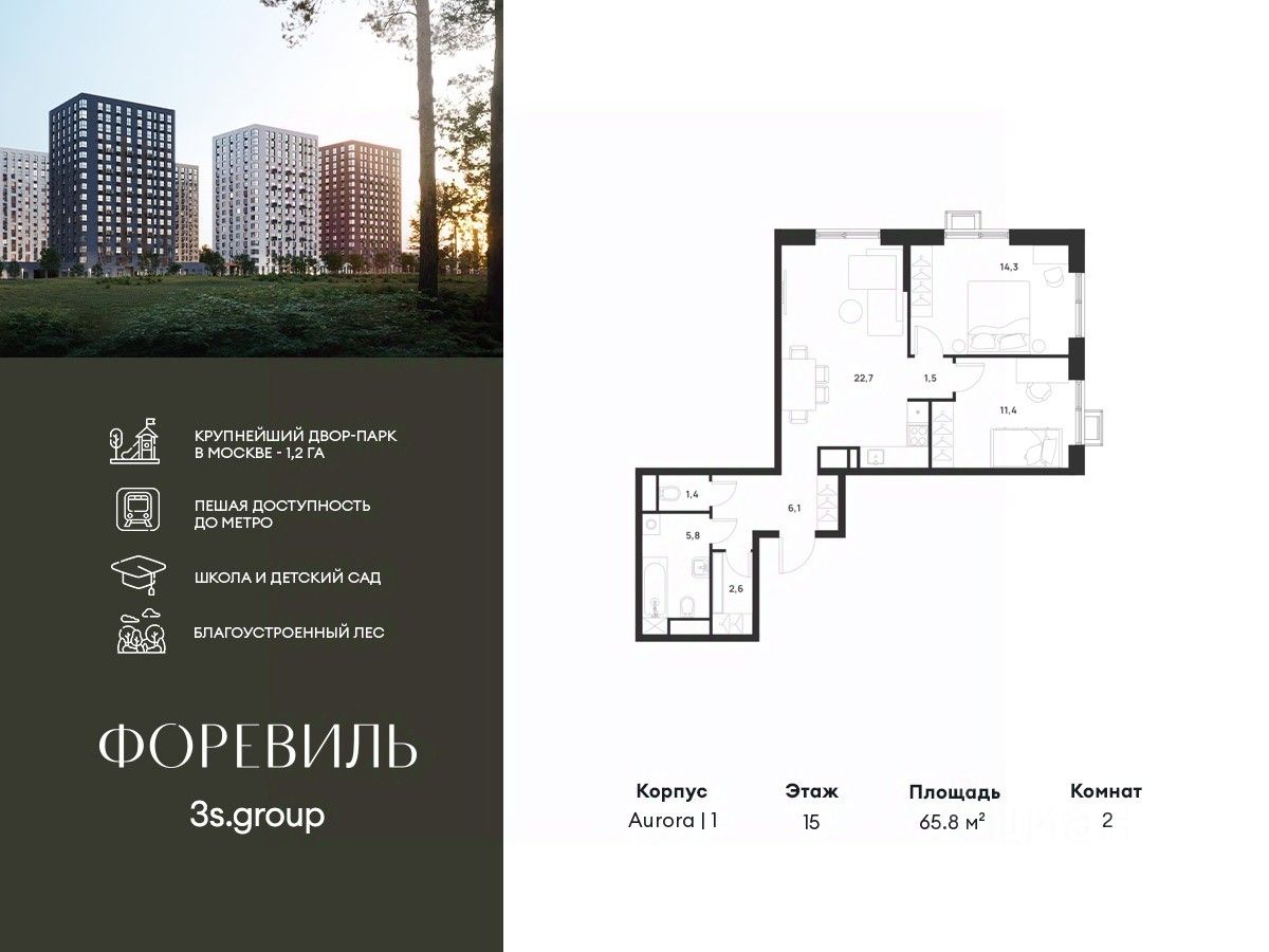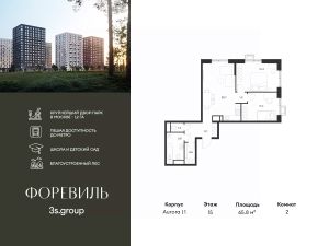 Продается уютная 2-комн. квартира площадью 65,8 кв.м на 15 этаже 17 этажного жилого комплекса бизнес-класса Foreville от 3S Group.
