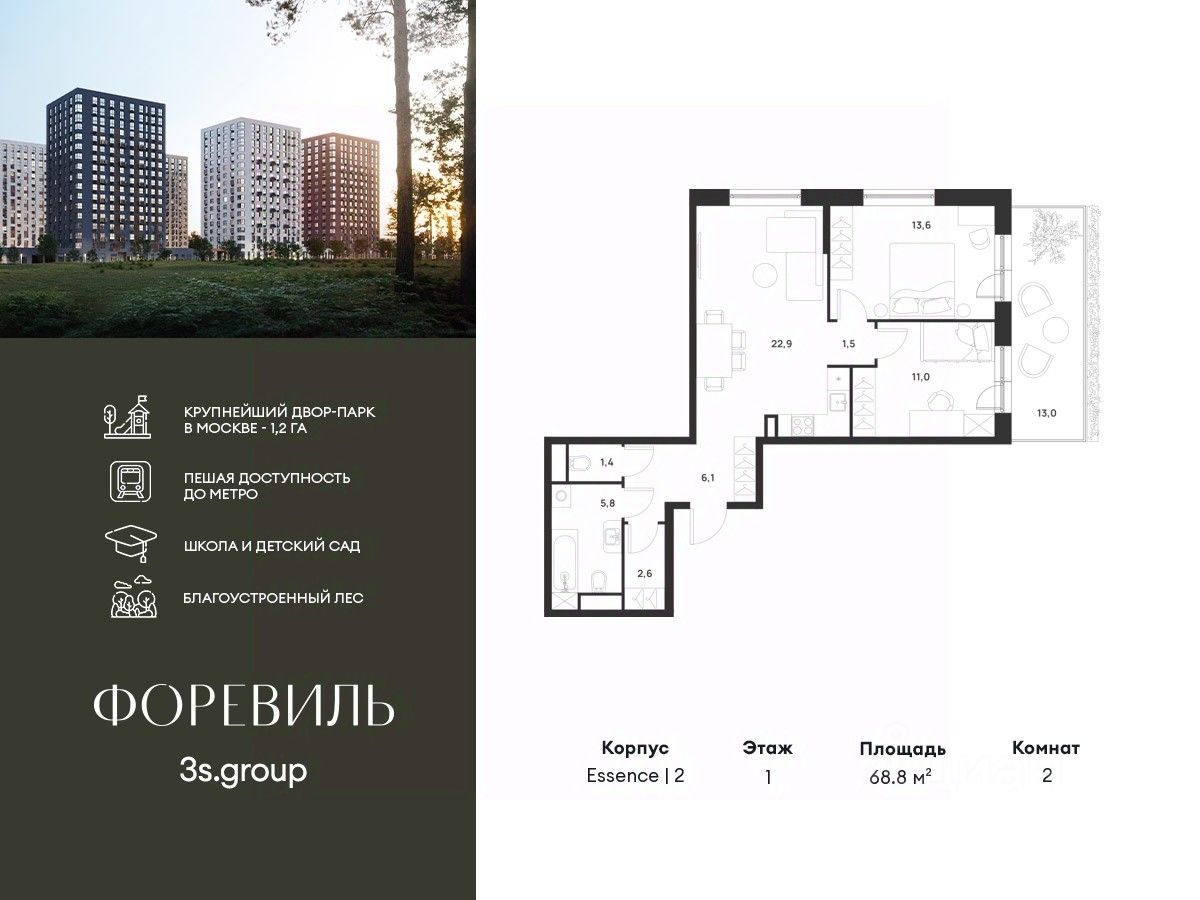 Предчистовая отделка в подарок! Пешая доступность от метро и московская прописка! Продается уютная 2-комн. квартира площадью 68,8 кв.м на 1 этаже 17 этажного жилого комплекса бизнес-класса Foreville от 3S Group.
