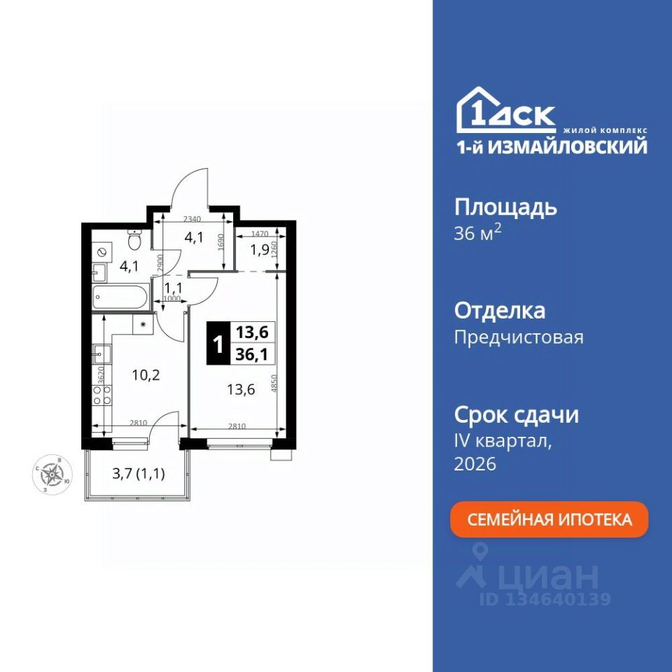 Продаётся 1-к квартира номер 11 общей площадью 36.1 кв.м. на 2-м этаже 25 этажного здания. Отделка Whitebox. Цена с учётом скидки.
