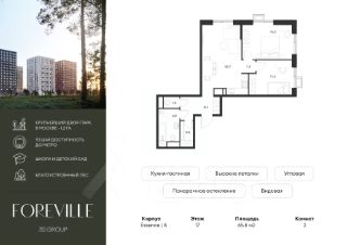 Предчистовая отделка в подарок! Пешая доступность от метро и московская прописка! Продается уютная 2-комн. квартира площадью 65,8 кв.м на 17 этаже 17 этажного жилого комплекса бизнес-класса Foreville от 3S Group.