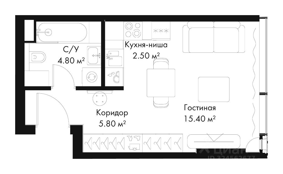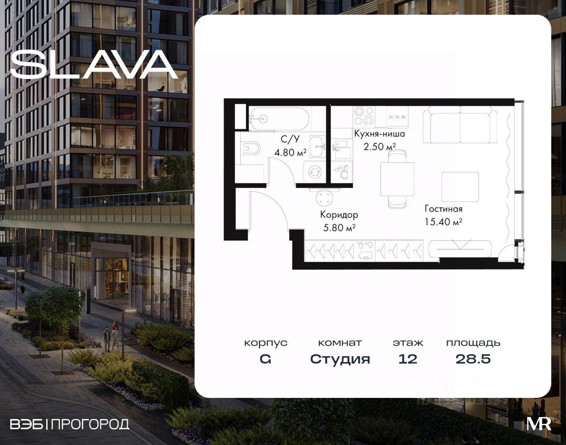 В продаже студия площадью 28.50 м² на 12-м этаже корпуса G.