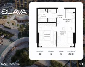 В продаже 1-комнатная квартира площадью 37.90 м² на 9-м этаже корпуса G.