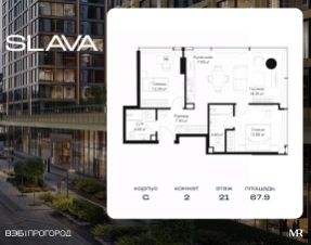 В продаже 2-комнатная квартира площадью 67.90 м² на 21-м этаже корпуса G.