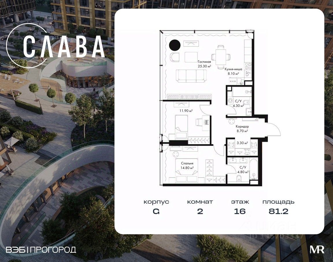 В продаже 2-комнатная квартира площадью 81.20 м² на 16-м этаже корпуса G.