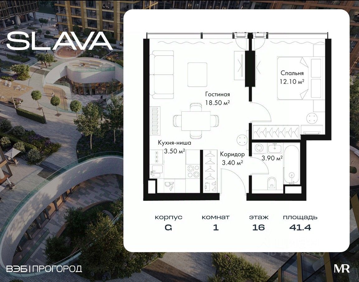 В продаже 1-комнатная квартира площадью 41.40 м² на 16-м этаже корпуса G.