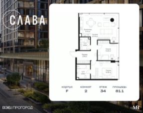 В продаже 2-комнатная квартира площадью 81.10 м² на 34-м этаже корпуса F.