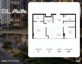 В продаже 2-комнатная квартира площадью 69 м² на 34-м этаже корпуса F.