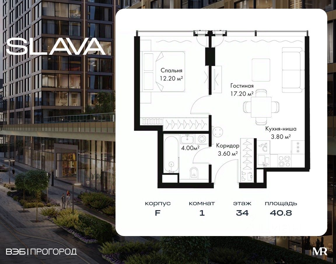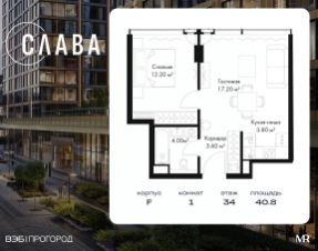 В продаже 1-комнатная квартира площадью 40.80 м² на 34-м этаже корпуса F.