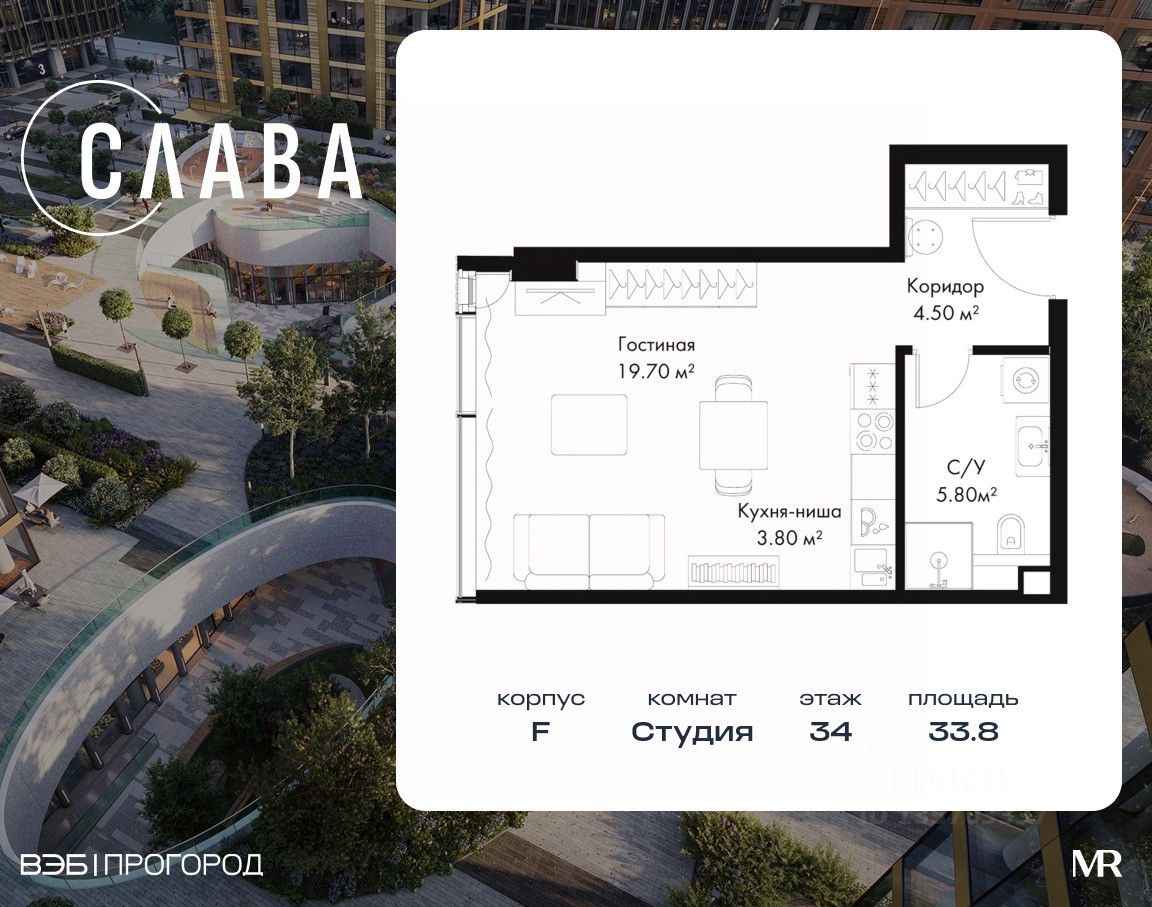 В продаже студия площадью 33.80 м² на 34-м этаже корпуса F.