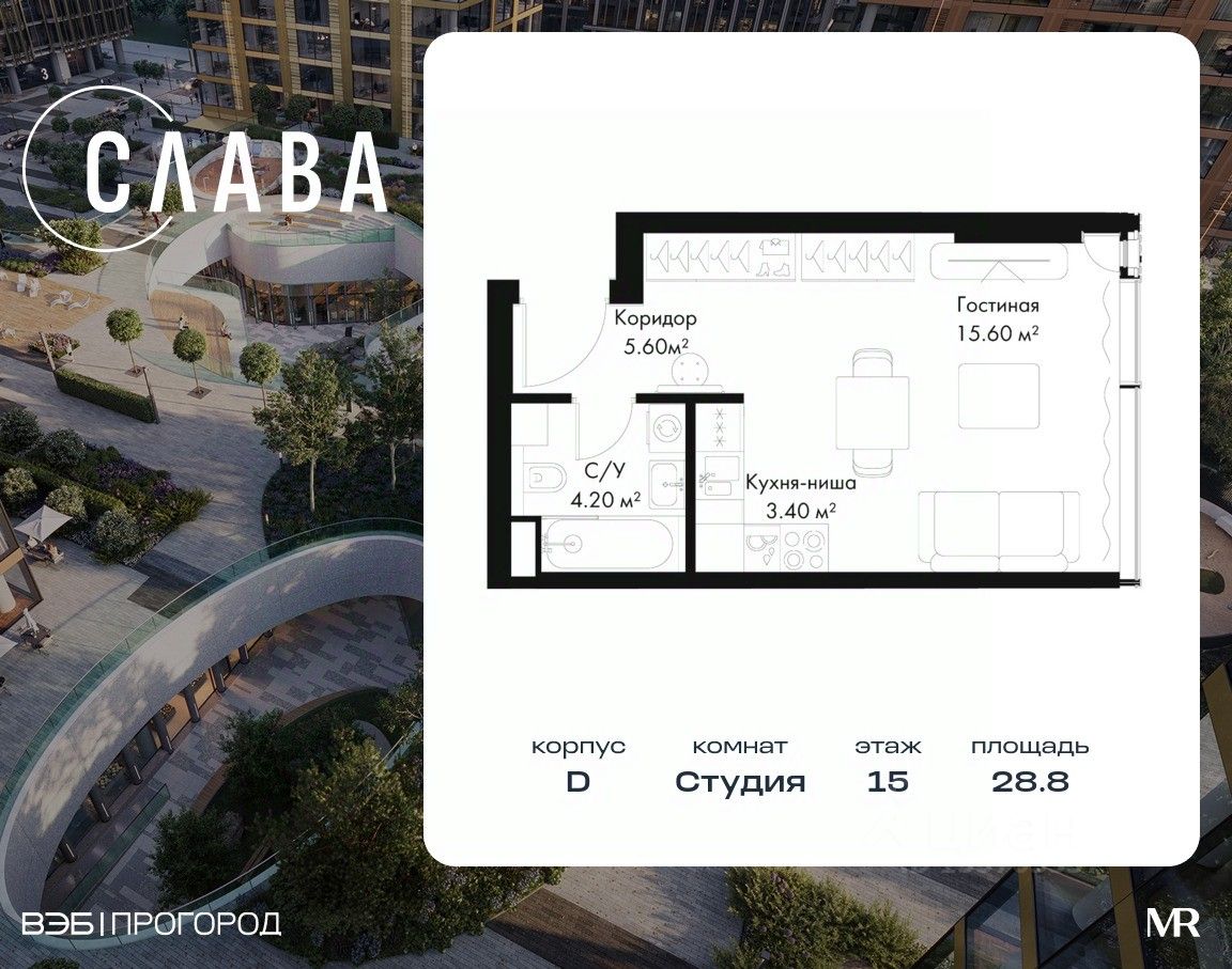 В продаже студия площадью 28.80 м² на 15-м этаже корпуса D.