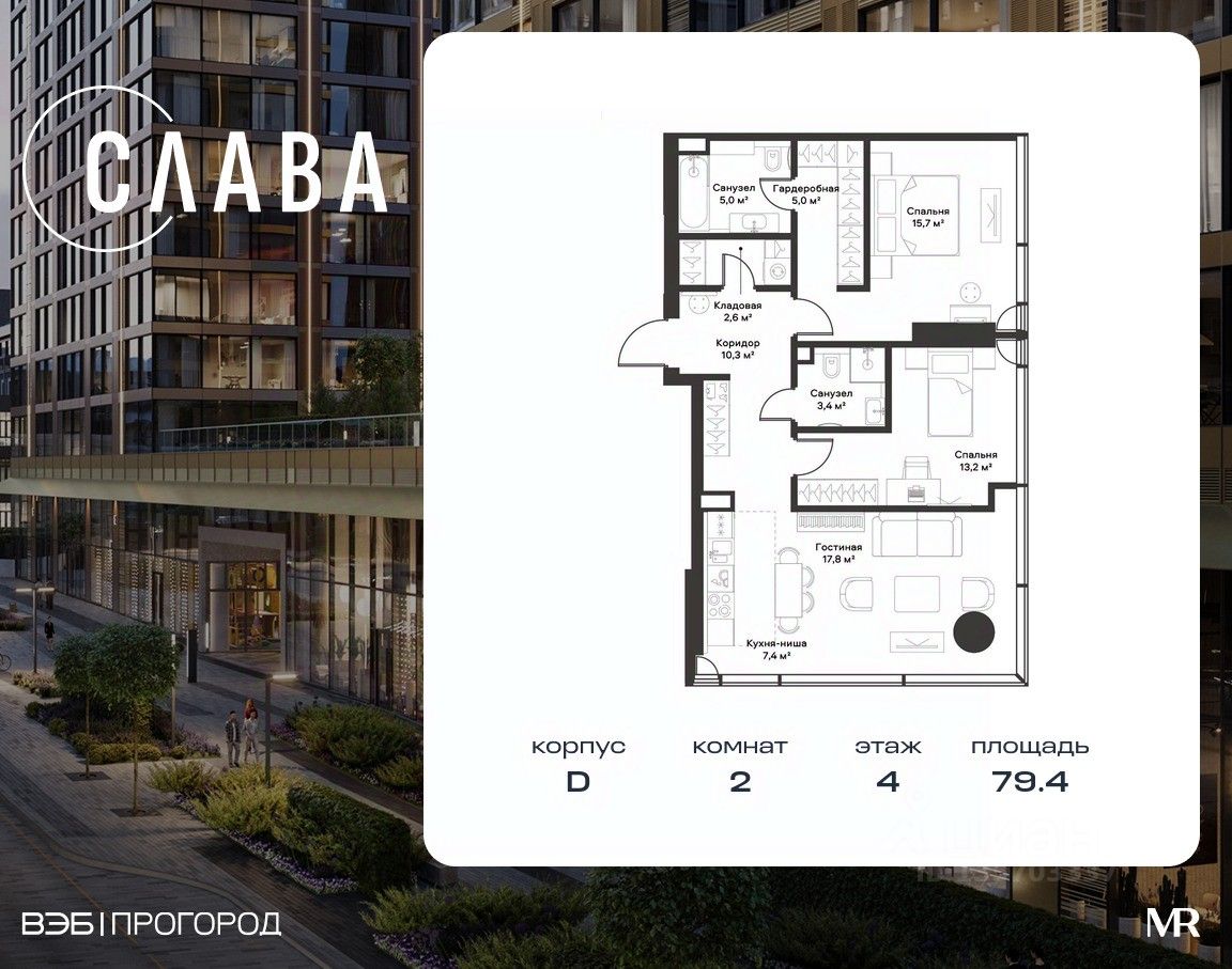 В продаже 2-комнатная квартира площадью 79.40 м² на 4-м этаже корпуса D.