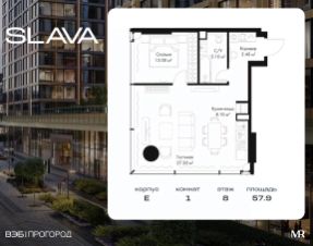 В продаже 1-комнатная квартира площадью 57.90 м² на 8-м этаже корпуса E.