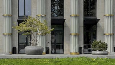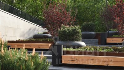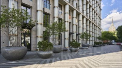 Лобби — решение от архитектурного бюро "T+T Architects". девятиметровые потолки с двойным светом, оформление в стиле тайги, берёзового и бамбукового леса. За зеркальной стойкой ресепшен вас ожидает консьерж, который поможет решить все бытовые вопросы. На внутренней территории дома небольшой сквер и детская площадка. Плитка выложена геометрическими узорами из гранита контрастных цветов. Для машин предусмотрели подземный паркинг на 125 мест с садом четырёх сезонов на крыше. На протяжении всего теплого времени года сад благоухает цветами — от ранневесеннего крокуса до осенней астры.