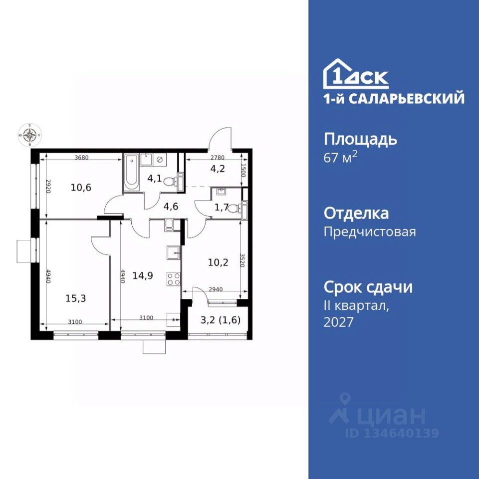 Продаётся 3-к квартира номер 26 общей площадью 67.2 кв.м. на 4-м этаже 25 этажного здания. Отделка Whitebox. Цена с учётом скидки.