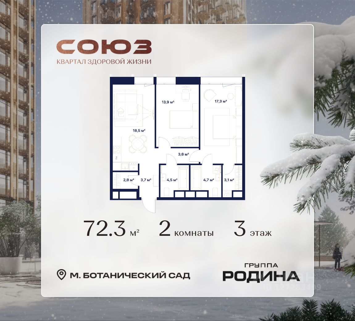 Продаётся 2-комнатная квартира площадью 72.3 м² на 3 этаже в Жилом Комплексе "Союз".