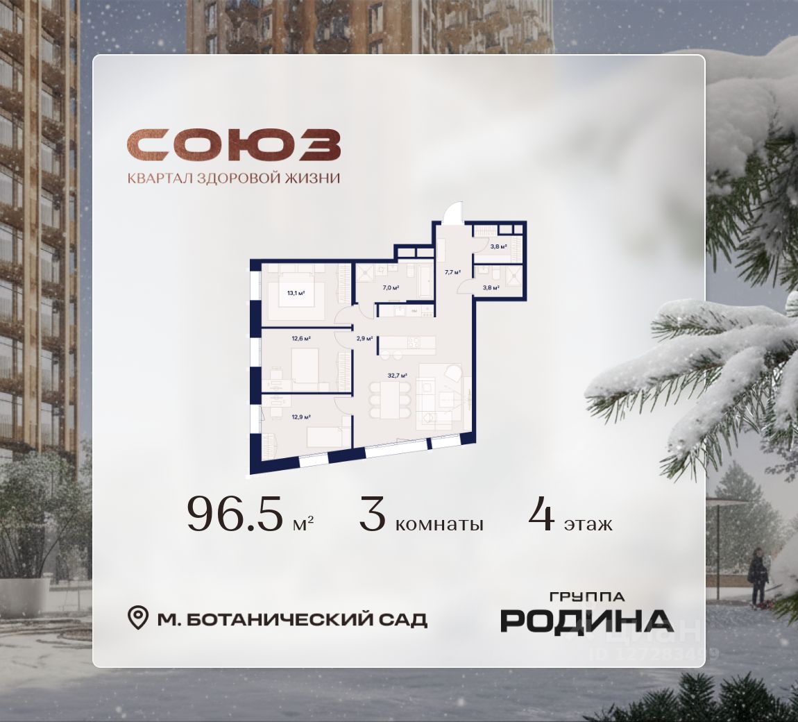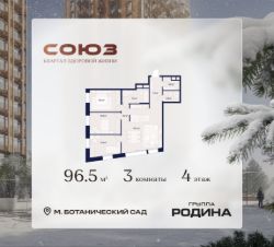 Продаётся 3-комнатная квартира площадью 96.5 м² на 4 этаже в Жилом Комплексе "Союз".
