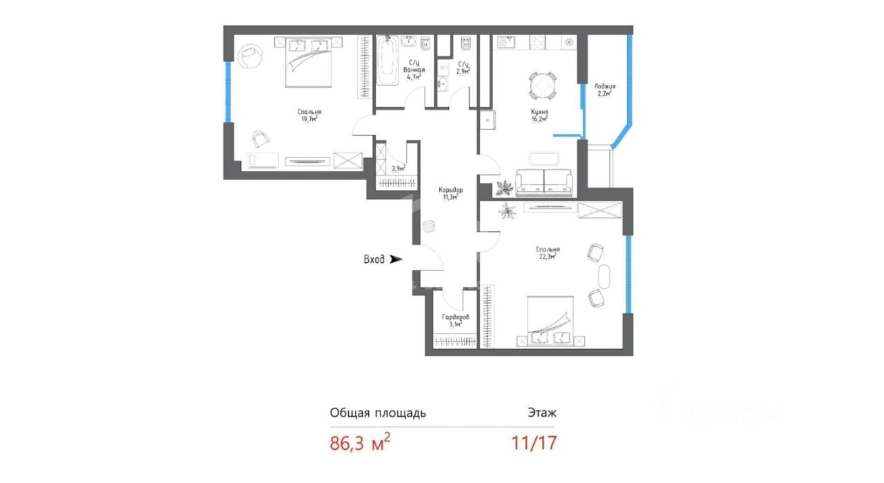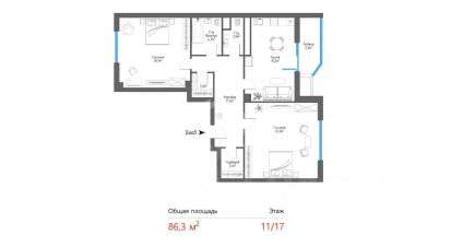 Представляем 2-комнатную квартиру, общей площадью 86.3 м², под отделку на 11-м этаже 17-этажного монолитного дома в ЖК "Мосфильмовский" вблизи реки Раменка. Можно приобрести машиноместо за отдельную плату.