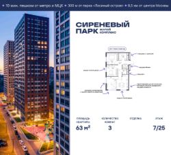 Продаётся просторная 3-комнатная квартира общей площадью 63 м² на 7 этаже в новом жилом комплексе "Сиреневый парк", расположенном в Восточном административном округе Москвы на улице Тагильская. Всего 10 минут ходьбы от станции метро "Бульвар Рокоссовского" и одноимённой платформы МЦК.
