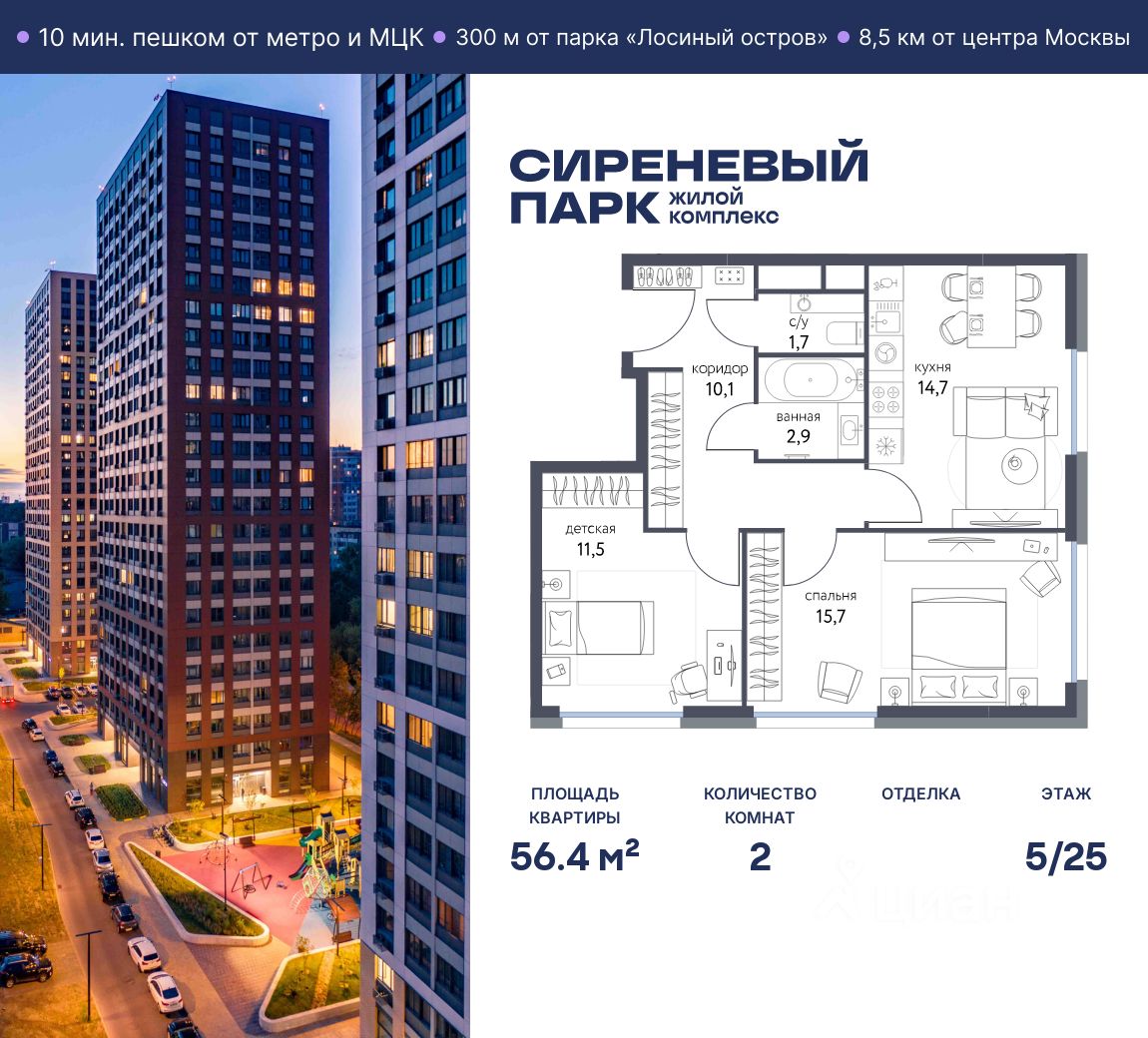 Продаётся просторная 2-комнатная квартира общей площадью 56.4 м² на 5 этаже в новом жилом комплексе "Сиреневый парк", расположенном в Восточном административном округе Москвы на улице Тагильская. Всего 10 минут ходьбы от станции метро "Бульвар Рокоссовского" и одноимённой платформы МЦК.