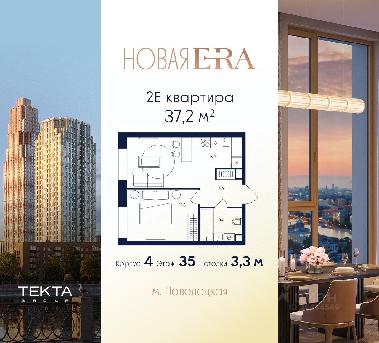2-комн. квартира в ЖК "Era" на 35 этаже в 43 этажном здании Корпус 4. Общая площадь: 37.2 кв.м., жилая: 23.70 кв.м. Высота потолков 3.30 м.