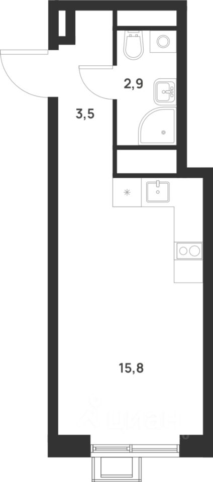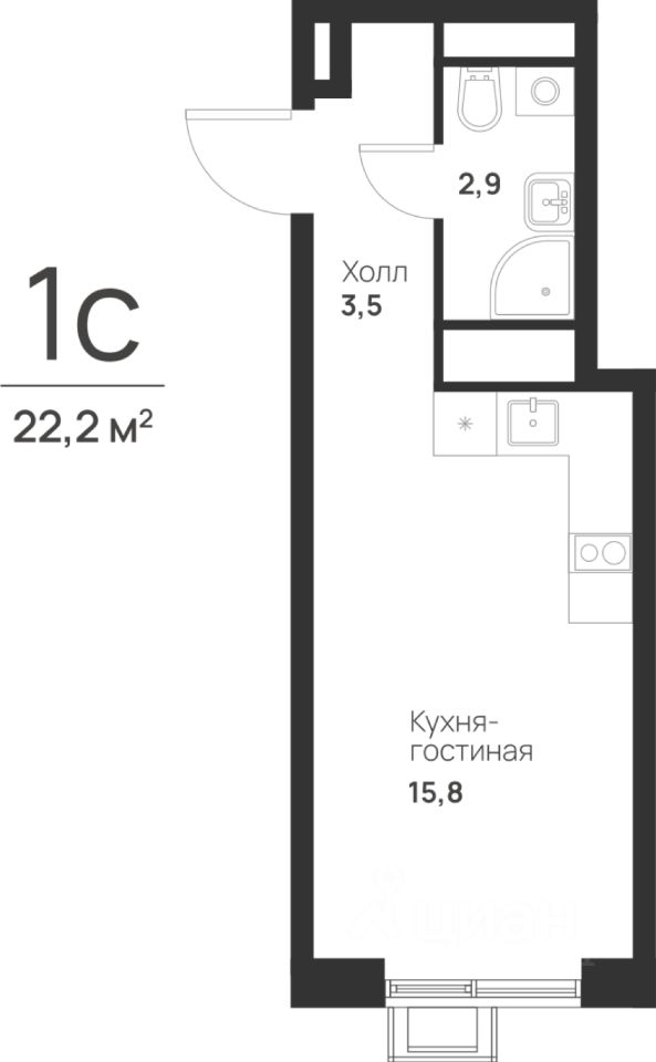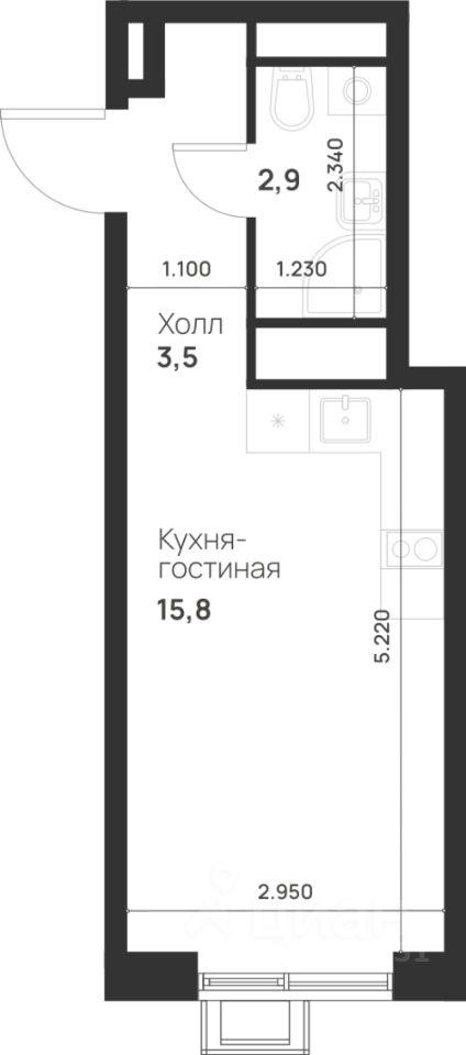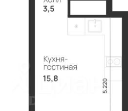 Общая площадь: 22,2 кв.м., жилая: 7,3 кв.м., площадь кухни-гостиной: 8,5 кв.м., высота потолков: 3 м., окна выходят во двор.
