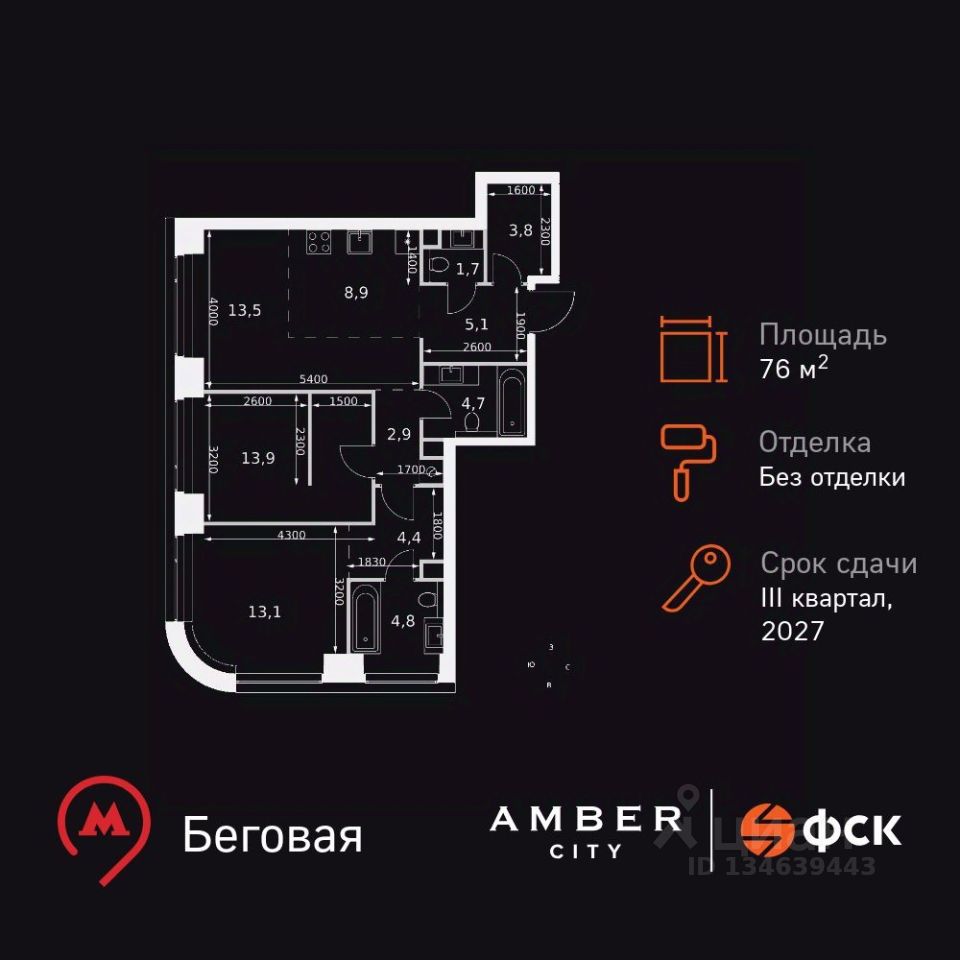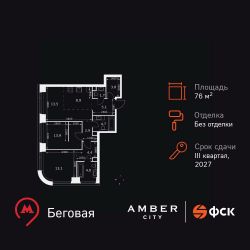 Продаётся 3-к квартира номер 8 общей площадью 76.8 кв.м. на 2-м этаже 46 этажного здания. Без отделки. Цена с учётом скидки.