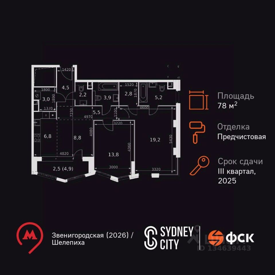 Продаётся 2-к квартира номер 282 общей площадью 78.2 кв.м. на 24-м этаже 26 этажного здания. Отделка Whitebox. Цена с учётом скидки.