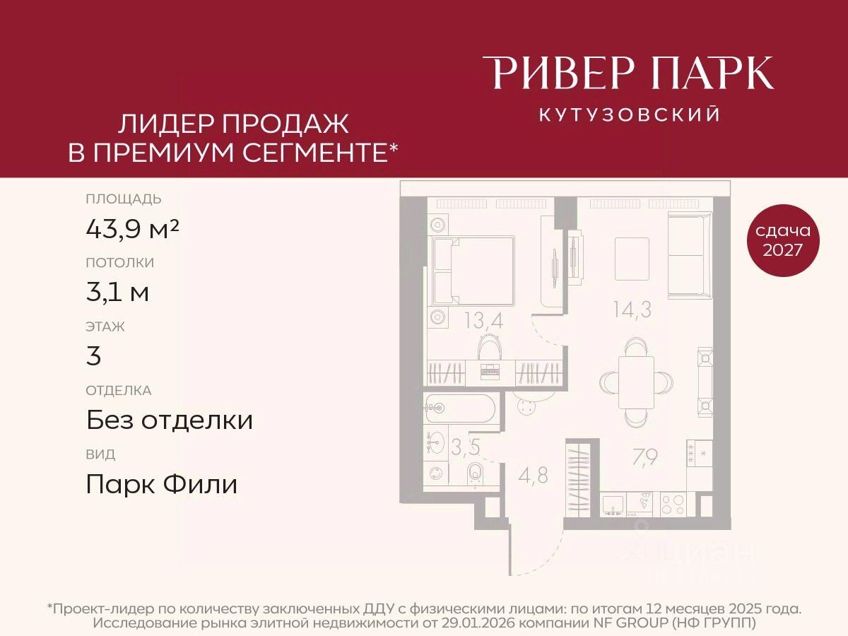 Продается 1-к квартира площадью 43.9 кв.м. на 3-м этаже в жилом комплексе премиум-класса Ривер Парк Кутузовский в Башне Лазурь