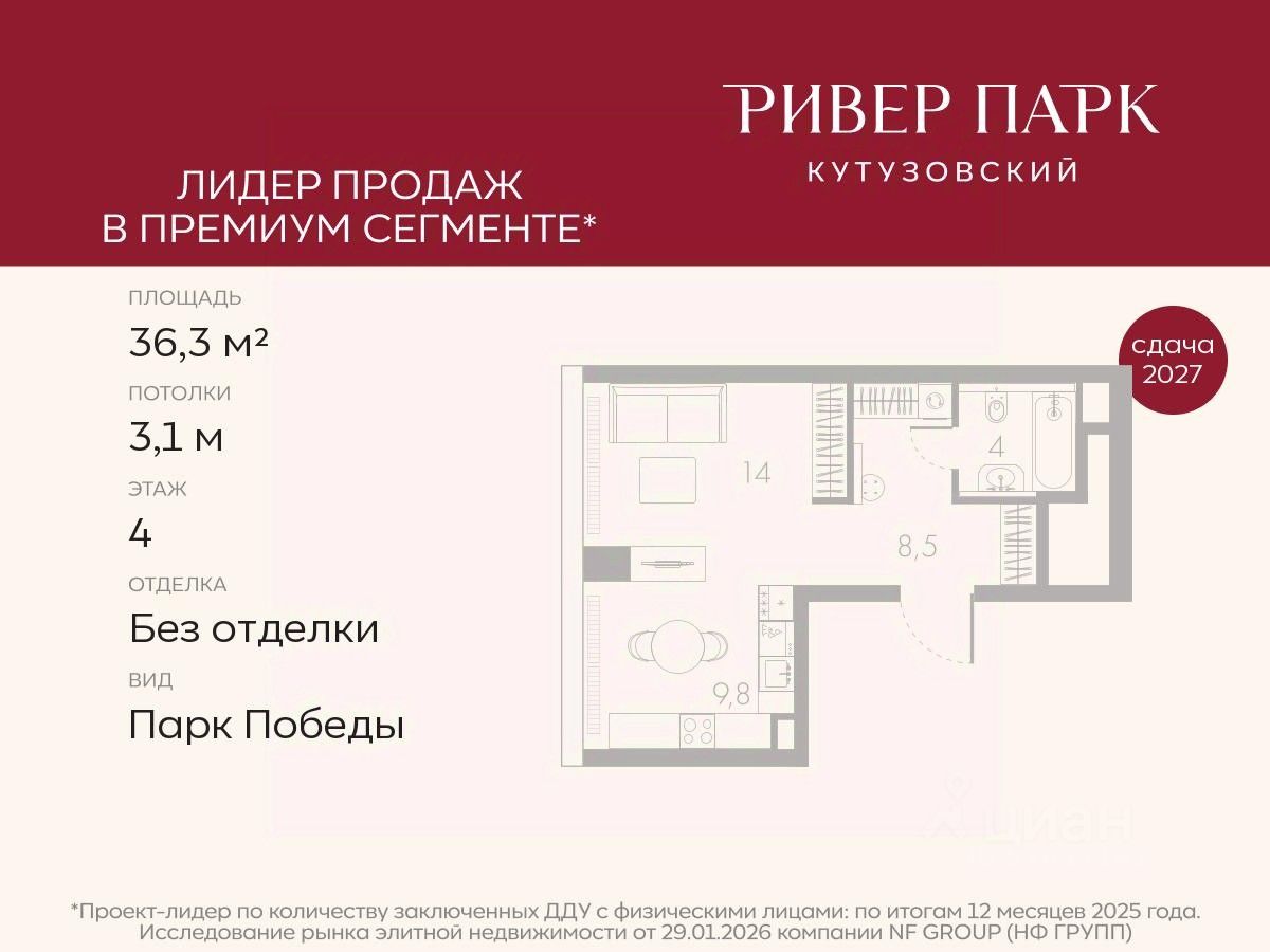 Продается студия площадью 36.3 кв.м. на 4-м этаже в жилом комплексе премиум-класса Ривер Парк Кутузовский в Башне Лазурь