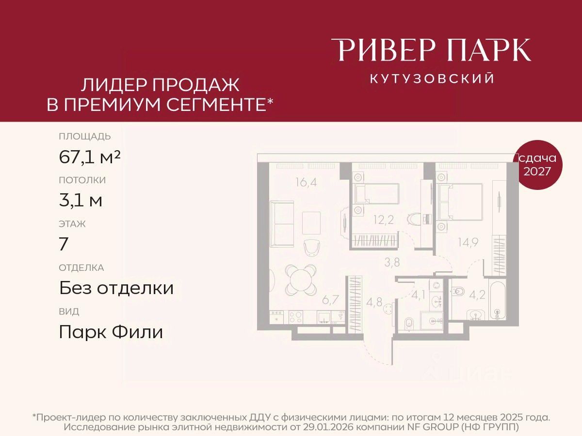 Продается 2-к квартира площадью 67.1 кв.м. на 7-м этаже в жилом комплексе премиум-класса Ривер Парк Кутузовский в Башне Лазурь