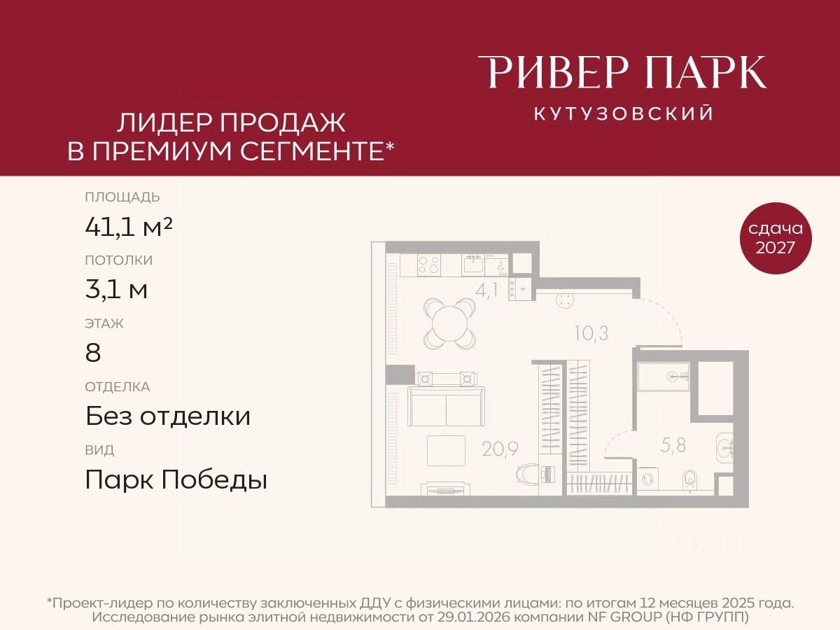 Продается студия площадью 41.1 кв.м. на 8-м этаже в жилом комплексе премиум-класса Ривер Парк Кутузовский в Башне Лазурь