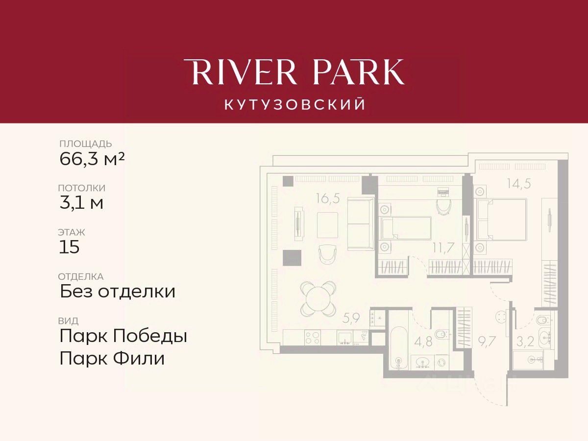 Продается 2-к квартира площадью 66.3 кв.м. на 15-м этаже в жилом комплексе премиум-класса River Park Кутузовский в Башне Lazur Tower