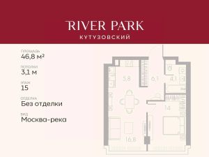 Продается 1-к квартира площадью 46.8 кв.м. на 15-м этаже в жилом комплексе премиум-класса River Park Кутузовский в Башне Lazur Tower
