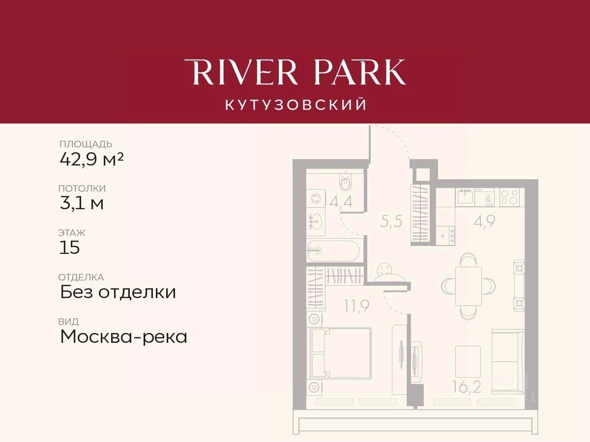 Продается 1-к квартира площадью 42.9 кв.м. на 15-м этаже в жилом комплексе премиум-класса River Park Кутузовский в Башне Lazur Tower
