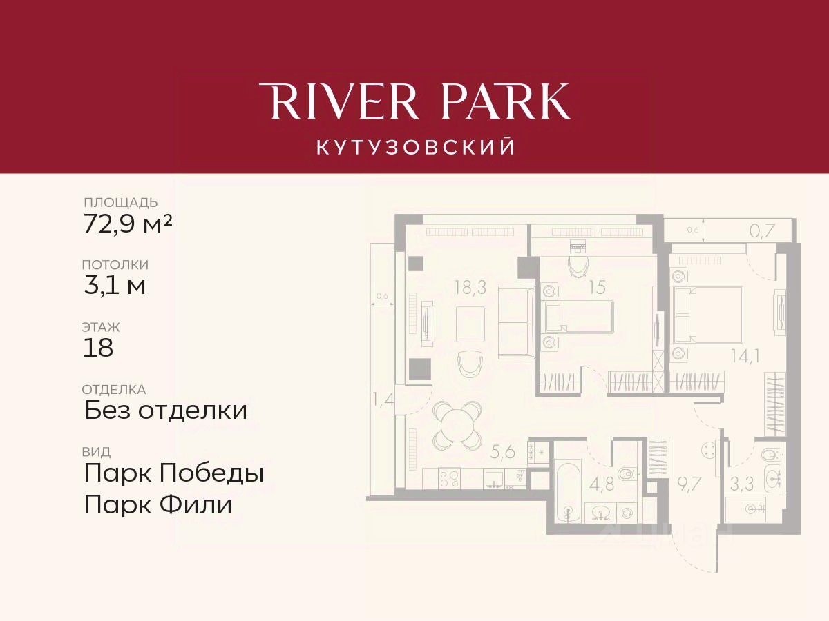 Продается 2-к квартира площадью 72.9 кв.м. на 18-м этаже в жилом комплексе премиум-класса River Park Кутузовский в Башне Lazur Tower