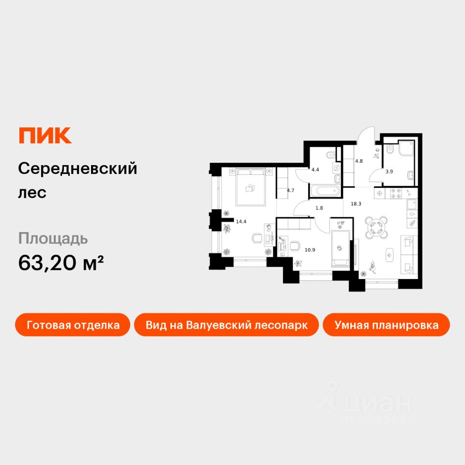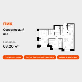 Продаётся 2-комн. квартира площадью 63,2 кв.м на 11 этаже 16 этажного дома (Корпус 2.1.2, Секция 2) проекта ПИК Середневский лес. Светлый просторный подъезд на уровне земли, функциональная планировка, большие окна, c отделкой.