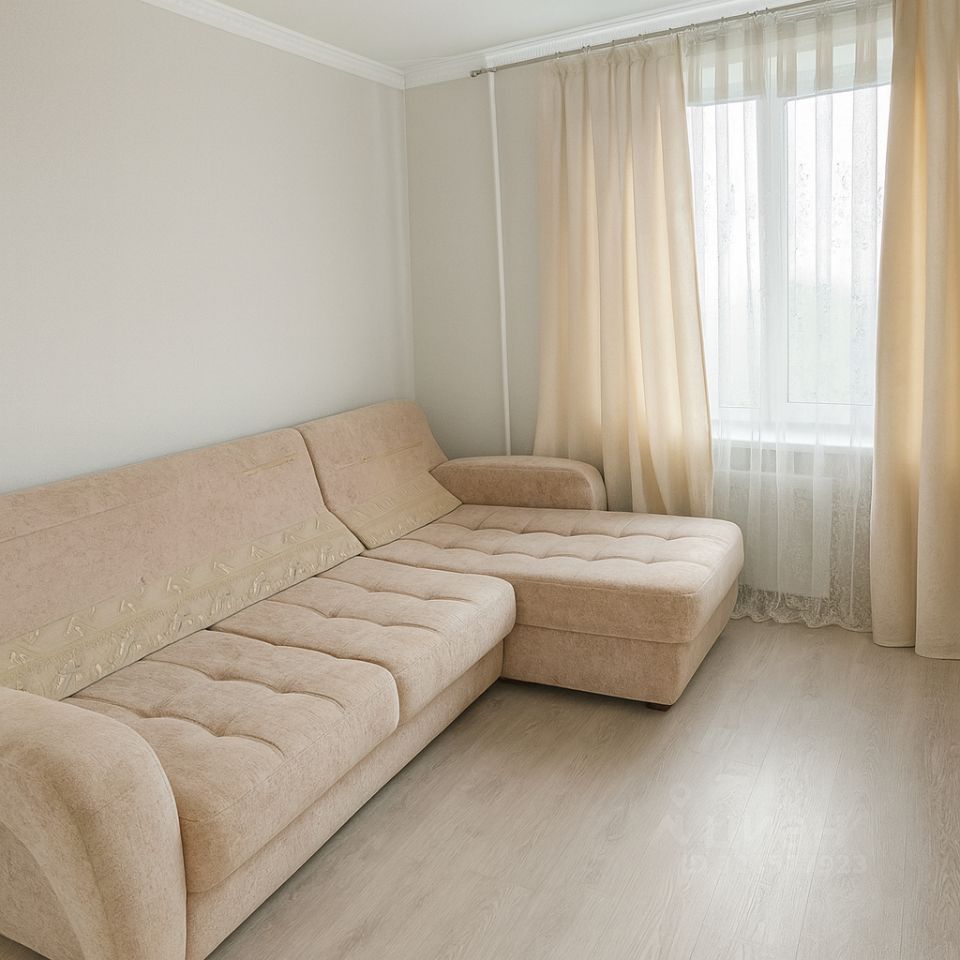 • Светлая жилая комната с большим окном и выходом на балкон.