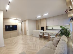 Квартира с новым дизайнерским ремонтом; цвета, фактуры, стиль, еще долгое время не потеряют своей актуальности. Функциональная планировка с продуманными местами для хранения скрывает визуальный шум, экономит время на поиск необходимого и облегчает уборку. Квартира полностью укомплектована новейшей бытовой техникой, включая посудомоечную, стиральную и сушильную машину, два холодильника, духовой шкаф, вытяжку, установлена система кондиционирования в каждой комнате и в кухне-гостинной. В С/У установлен бойлер, гребенки на горячее и холодное водоснабжение, фильтры грубой очистки, датчики защиты от протечек.