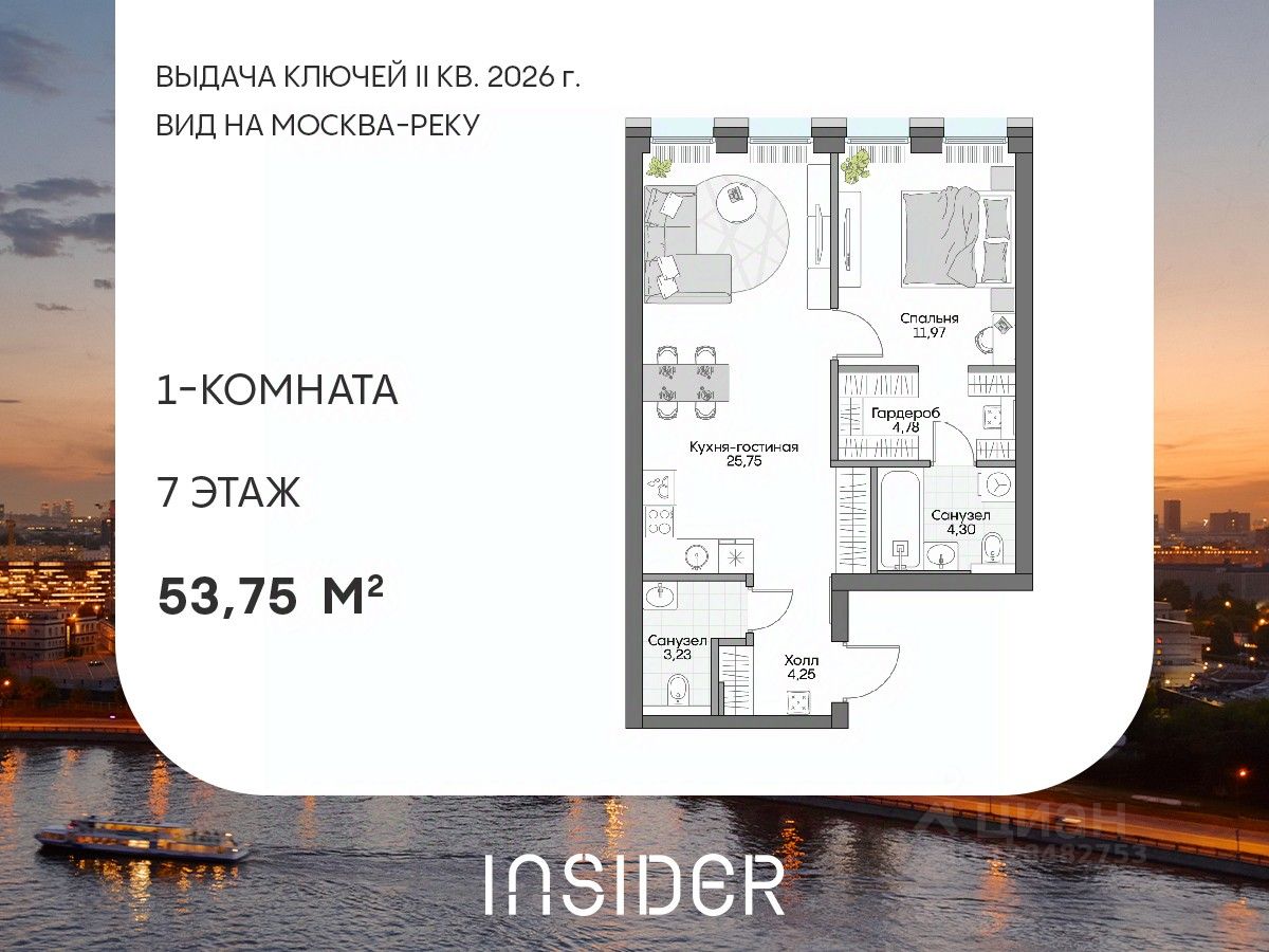 Агентам не звонить. Просторный однокомнатный лот в Доме на набережной INSIDER. Сервисные лоты с системой "умный дом" на первой линии Москвы-реки.