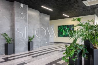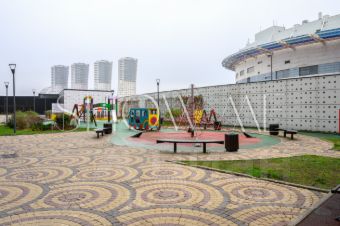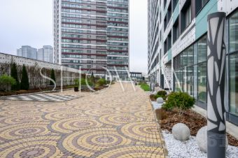 Огороженная охраняемая территория внутреннего двора с детскими площадками на крыше третьего уровня стилобата, презентабельная входная группа, круглосуточное видео наблюдение, вход по пропускам.