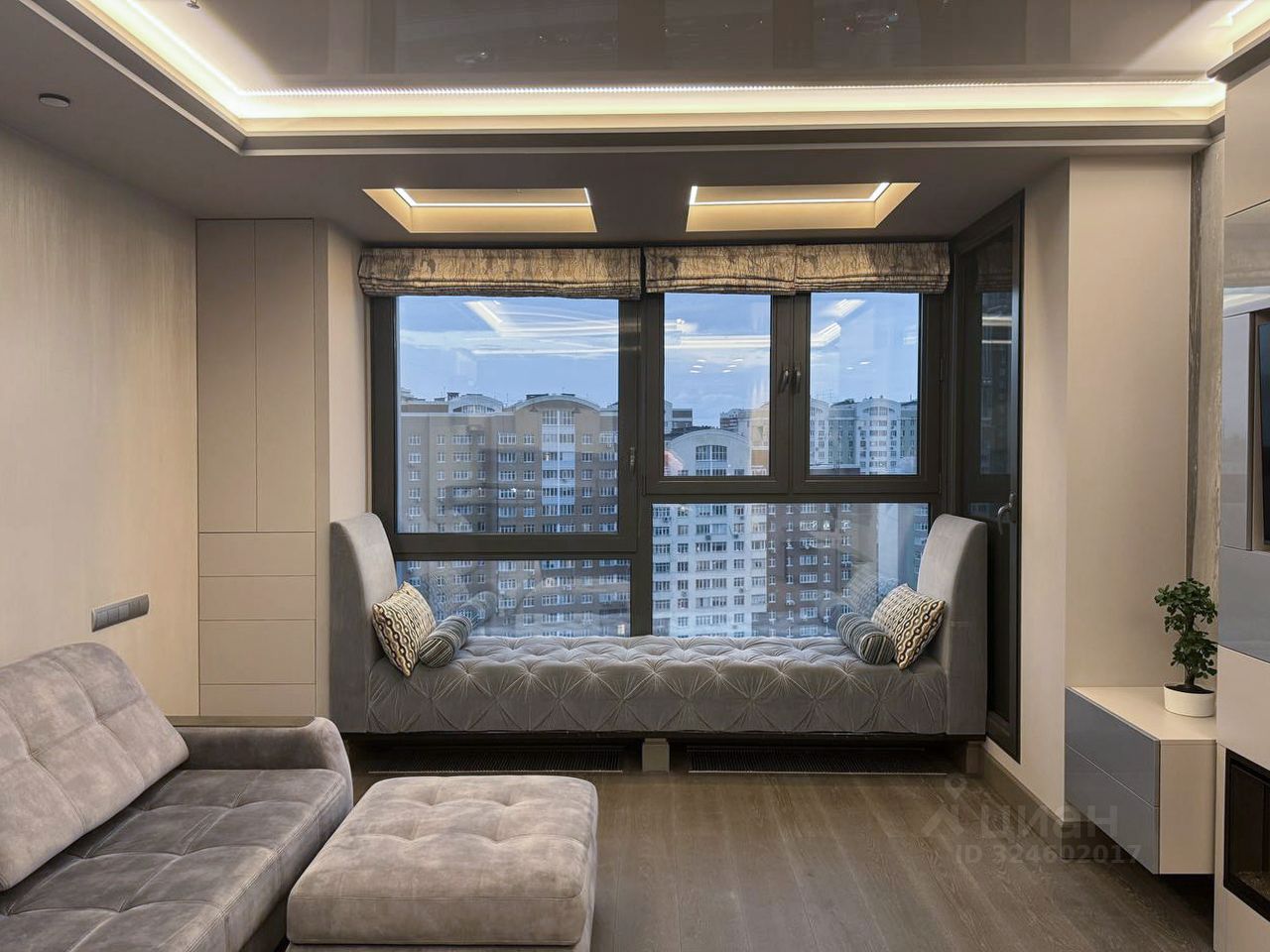 Высокие потолки, панорамные окна, много света, отличный вид с высокого этажа.
