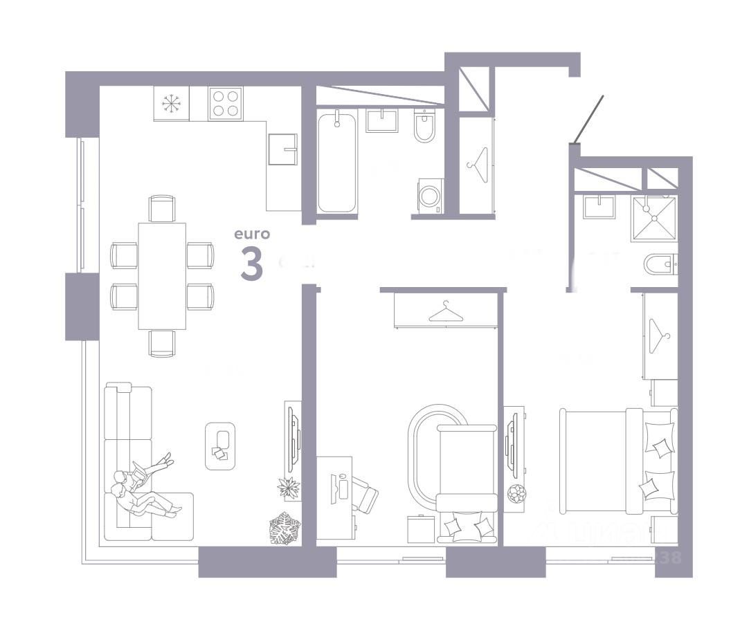 Планировка: кухня-столовая, гостиная с выходом на балкон, мастер-спальня с собственным санузлом, вторая спальня, гостевой санузел и холл.