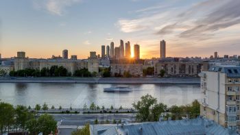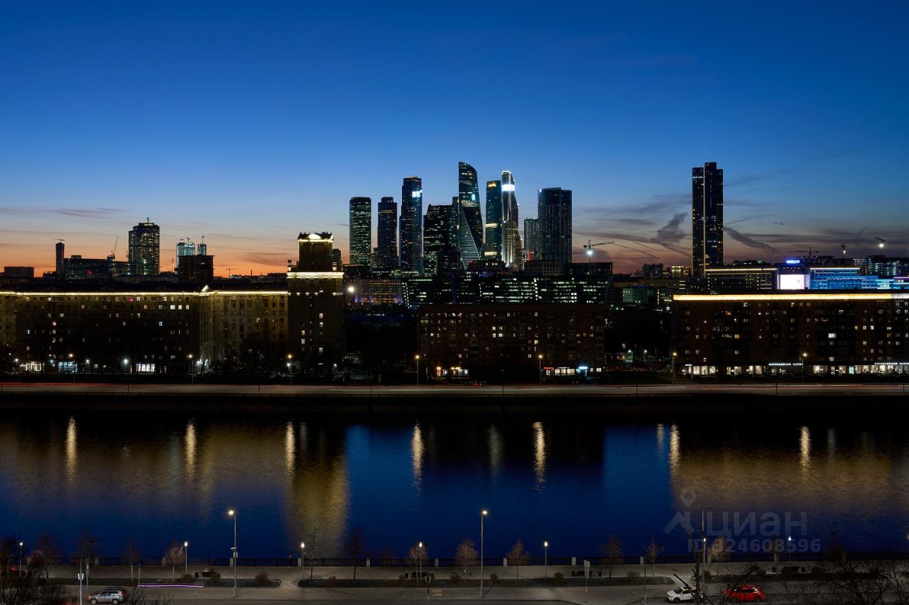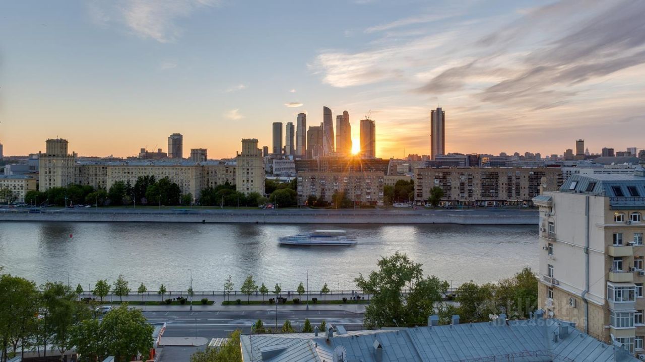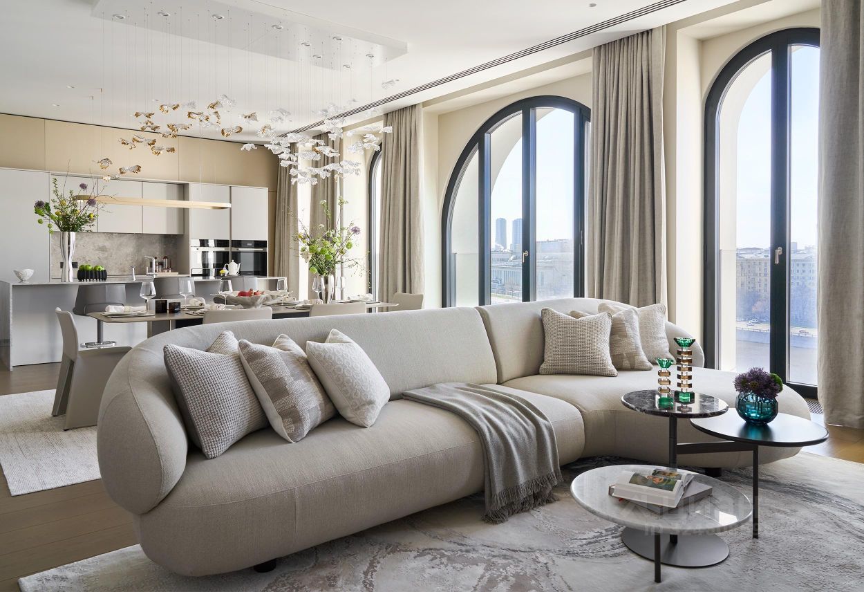 Арочные панорамные окна открывают длинные виды на *Москва-Сити, Саввинскую набережную и Москву-реку* - редкая комбинация направлений для дома Brodsky.