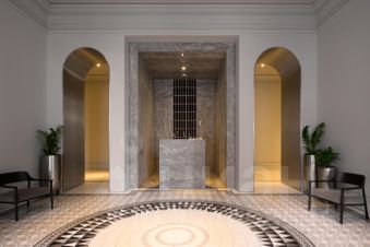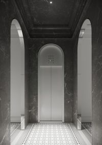 Лобби выполнено из натурального мрамора, с высокими арочными окнами и спокойной современной палитрой.